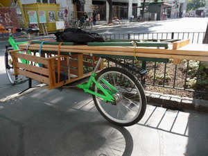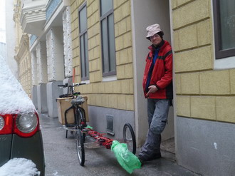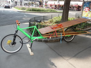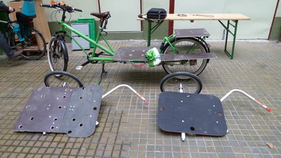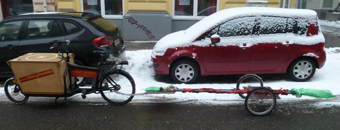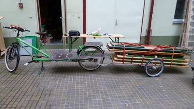 Akkut wurde die Idee durch Heavy Pedals, die Lastenrad Company, welche ich mitgründete. Wir wollen so gut wie (fast) alles per Radl transportieren. Ich hatte Heurigenbank Garnituren zu fahren, wie ihr rechts und links seht. Wie schon oben erwähnt wurde das Rad durch die Länge und das Gewicht unruhig. |