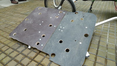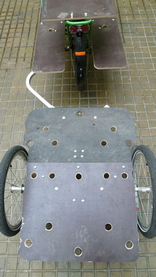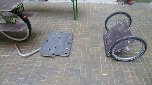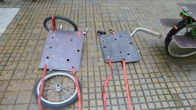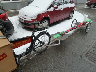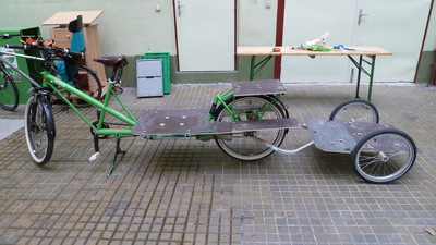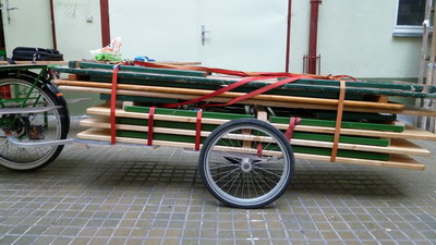 Also realisierte ich nun über 2 Jahr später die Idee :-) Ich zerschnitt einen Carry Freedom Y Fame 20" Anhänger. Montierte auf je einem Teil, also der Deischsel und der Achse, eine neue Ladefläche. Stattete diese mit vielen Löchern aus, damit man an diese dann die Ladung per Zurrgurten befestigt. Fertig ist das Ding... Auch ist er als normaler Anhänger zu verwenden, denn die 2 Hälften kann ich mit 5 Schrauben starr miteinander verbinden. Das Zugradl sollte aber einen langen Radstand haben. Bei Kurzem überholt einem beim Bremsen das Hinterrad, denn der Anhänger schiebt gewaltig :-) Und los gehts! |