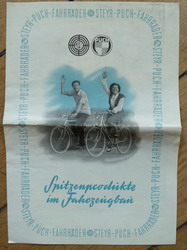 Drittes Reich 1939 spätestens in diesem Jahr sind die Fahrräder von Steyr Daimler Puch AG vollends gleich, egal ob sie Puch, Styria, Steyr u.ä auf den Steuerkopf stehen haben 1943/44 Im Süden von Graz wurde das 500 000m2 grosse Werk Thonsdorf aus dem Boden gestampft. Mit 120 000m2 verbauter Fläche. dies sollte bis Mitte der 1950er Jahre eines der modernsten und grössten Zweiradproduktionstätten Europas bleiben. Zweite Republik 1945 Hälfte des Werkes wurde durch Bomben zerstört 300 Arbeiter verblieben Herbst wurden wieder Fahrräder produziert |